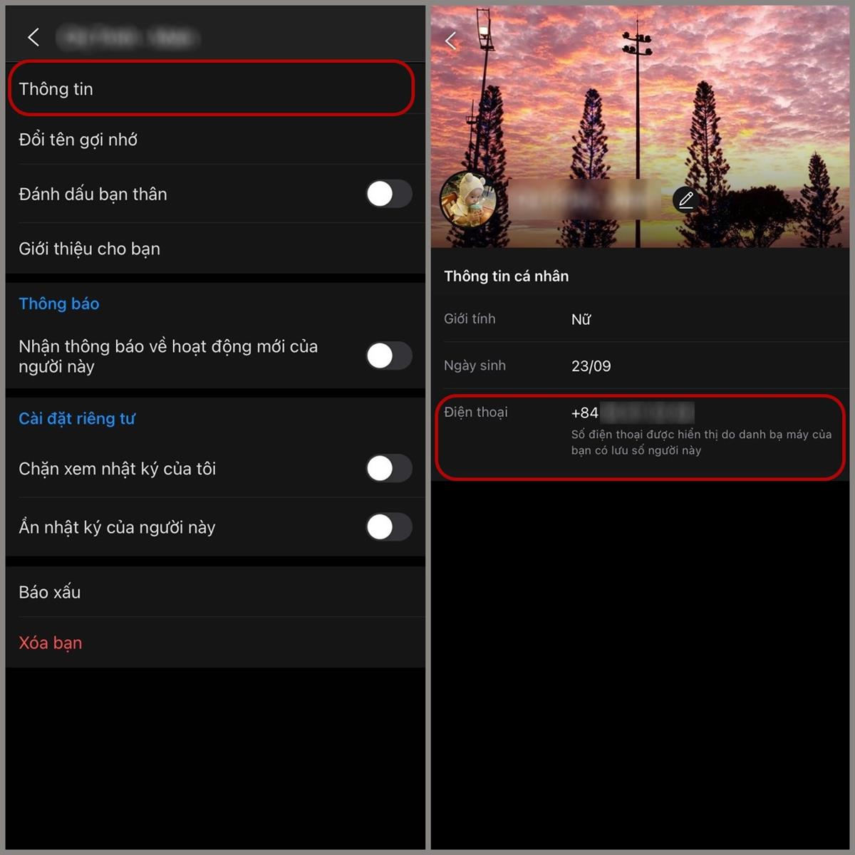 Bước 3: Chọn mục Thông tin > Lúc này sẽ thấy thông tin số điện thoại của bạn bè.
