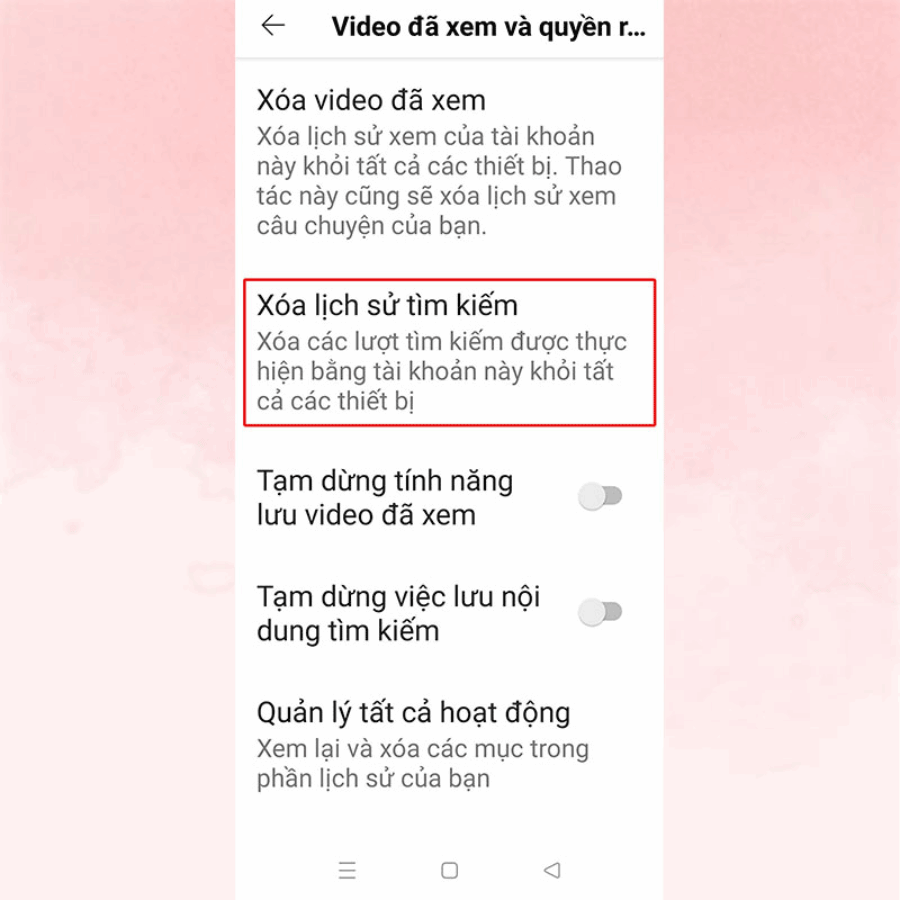 Bước 5: Cuối cùng, bạn chọn mục Xoá lịch sử tìm kiếm -> Ấn chọn XOÁ LỊCH SỬ TÌM KIẾM là xong.