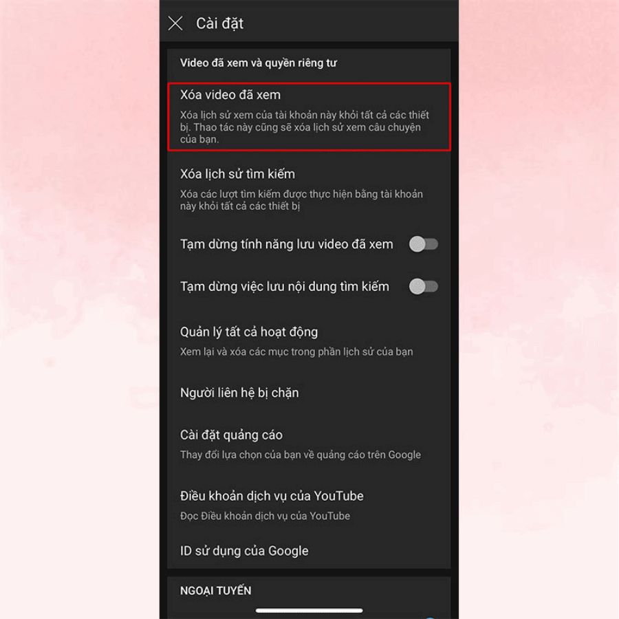 Bước 4: Tiếp đến, bạn chọn mục Xoá video đã xem -> Ấn vào XOÁ VIDEO ĐÃ XEM.