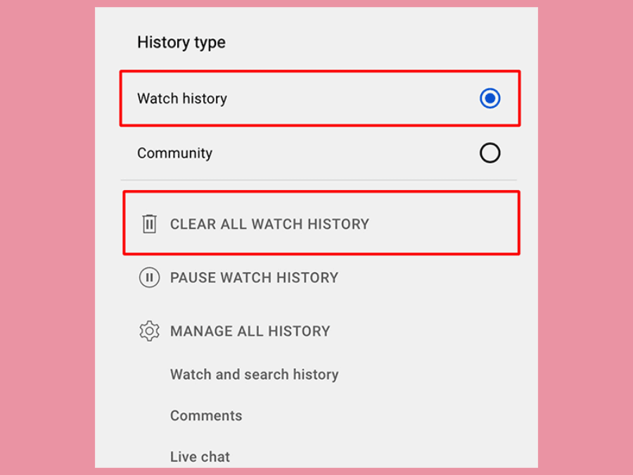 Hoặc bạn có thể chọn mục Watch history -> Ấn vào CLEAR ALL WATCH HISTORY -> Nhấn chọn CLEAR ALL WATCH HISTORY để xoá toàn bộ nội dung đã xem.