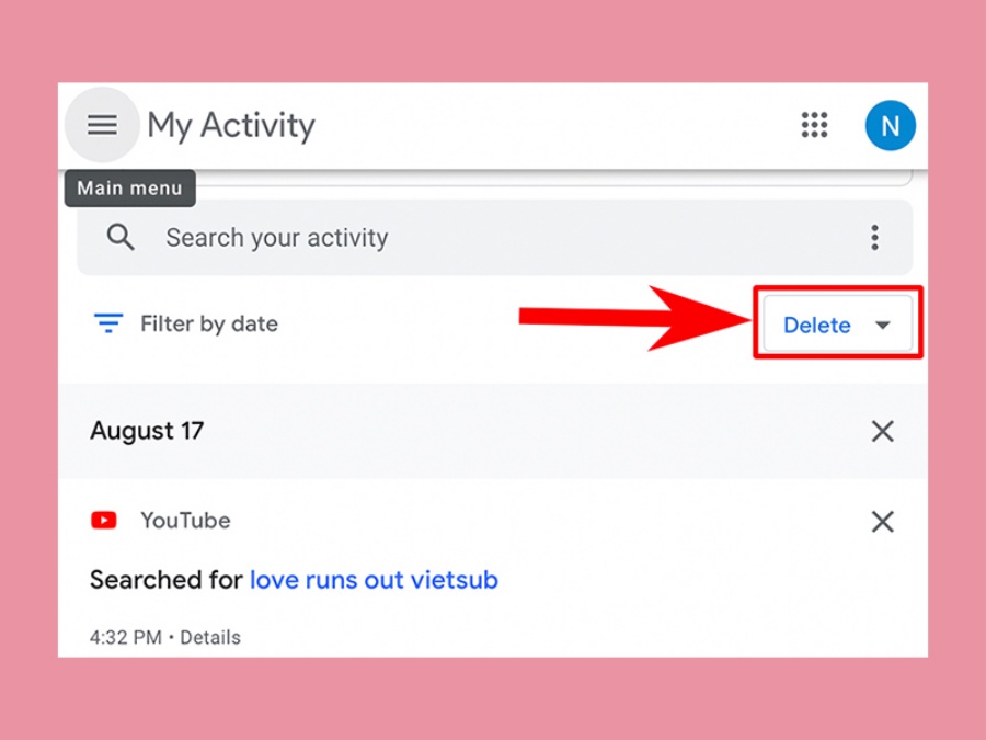 Bước 5: Tiếp theo, để xoá tất cả lịch sử tìm kiếm bạn nhấn vào nút Delete.