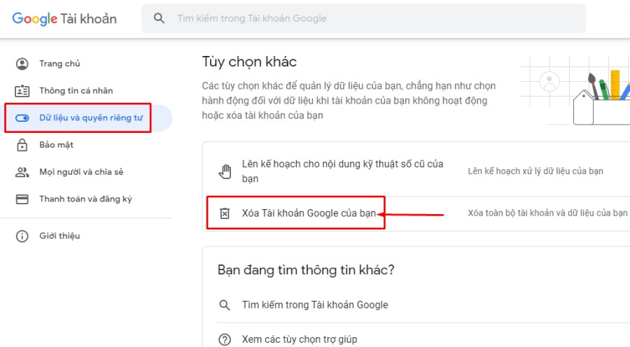 Bước 2: Tiếp theo, bạn vào Dữ liệu và quyền riêng tư -> Tiến hành cuộn xuống đến mục Tùy chọn khác -> Nhấn chọn Xóa Tài khoản Google của bạn.