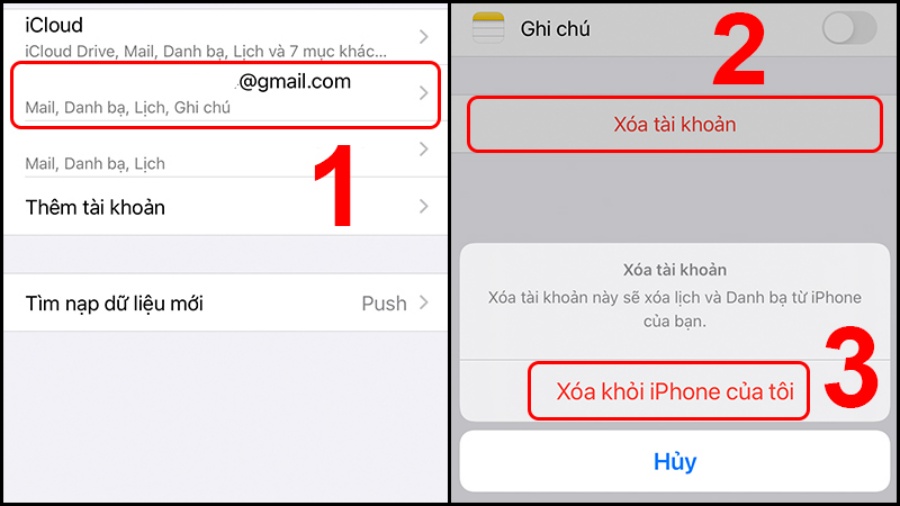 Bước 2: Sau đó, bạn chọn tài khoản Google bạn muốn gỡ -> Click vào Xoá tài khoản > Xóa khỏi iPhone của tôi là hoàn tất.