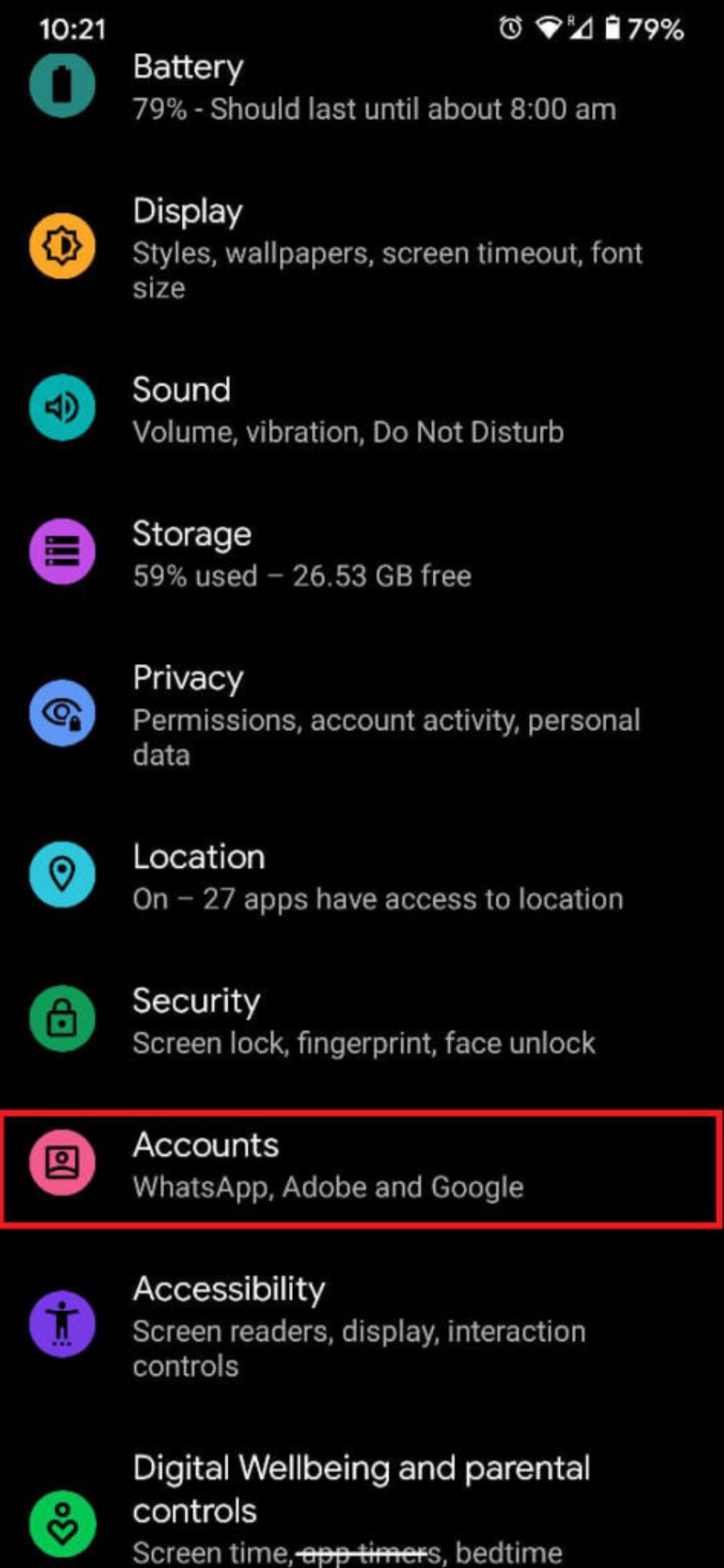Bước 1: Trước hết, bạn mở ứng dụng Settings/ Cài đặt -> Tiến hành cuộn xuống -> Bấm vào Account/ Tài khoản để tiếp tục.