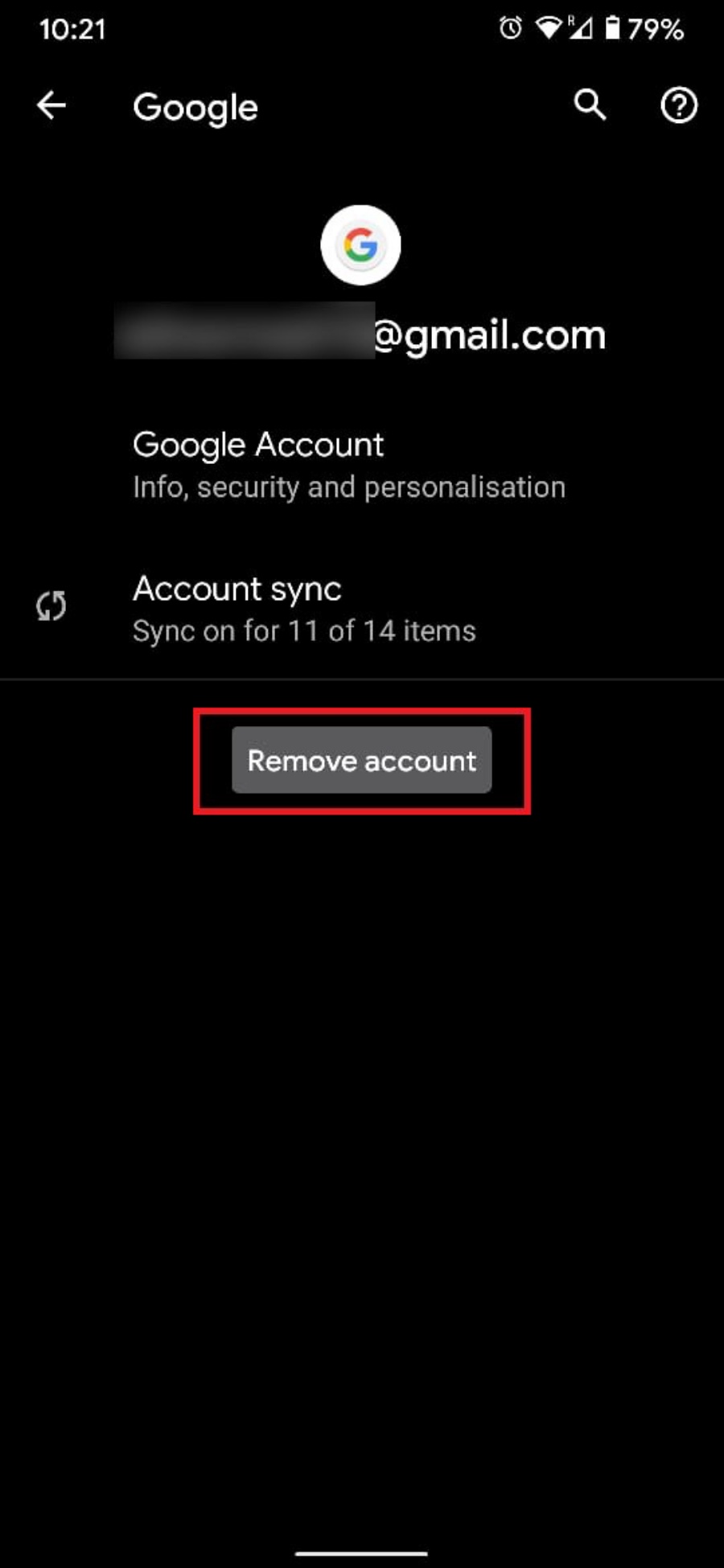 Bước 3: Tiếp theo, khi thông tin chi tiết của tài khoản được hiển thị, bạn hãy ấn Remove account/ Xóa tài khoản để xóa tài khoản Google khỏi thiết bị của bạn.