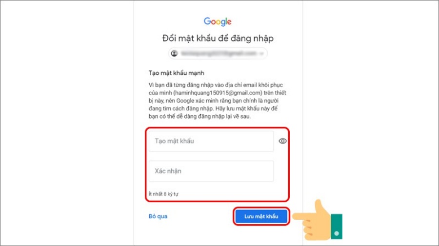 Bước 5: Tới đây, tài khoản của bạn đã được khôi phục thành công. Hãy tạo mật khẩu và Xác nhận -> Bấm Lưu mật khẩu.