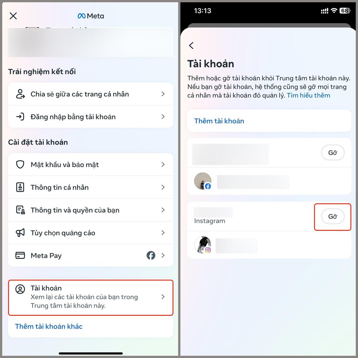 Bước 3: Nhấn chọn Tài khoản > Nhấn chọn tài khoản muốn gỡ là hoàn thành.