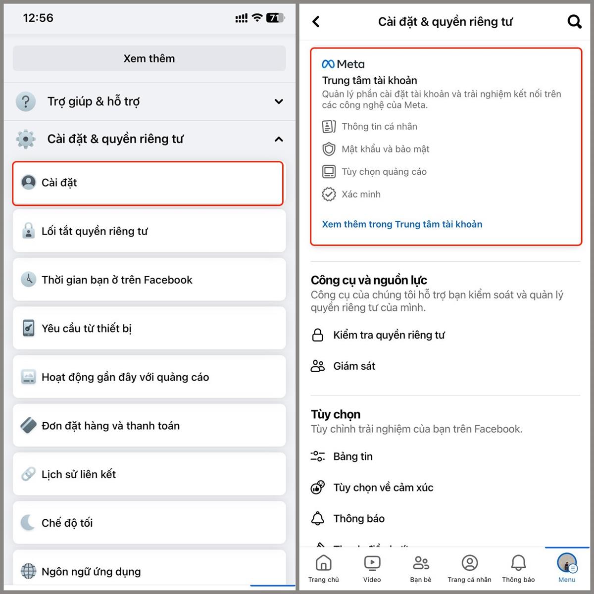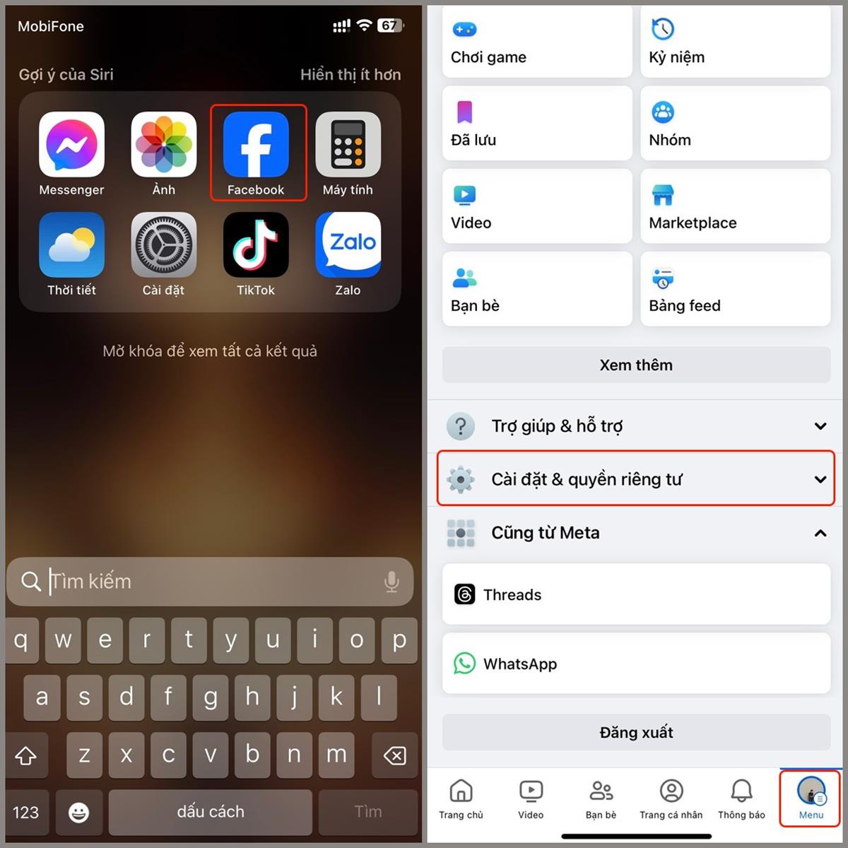 Bước 1: Vào ứng dụng Facebook trên điện thoại > Chọn Menu > Chọn Cài đặt & quyền riêng tư dùm mình nhé.
