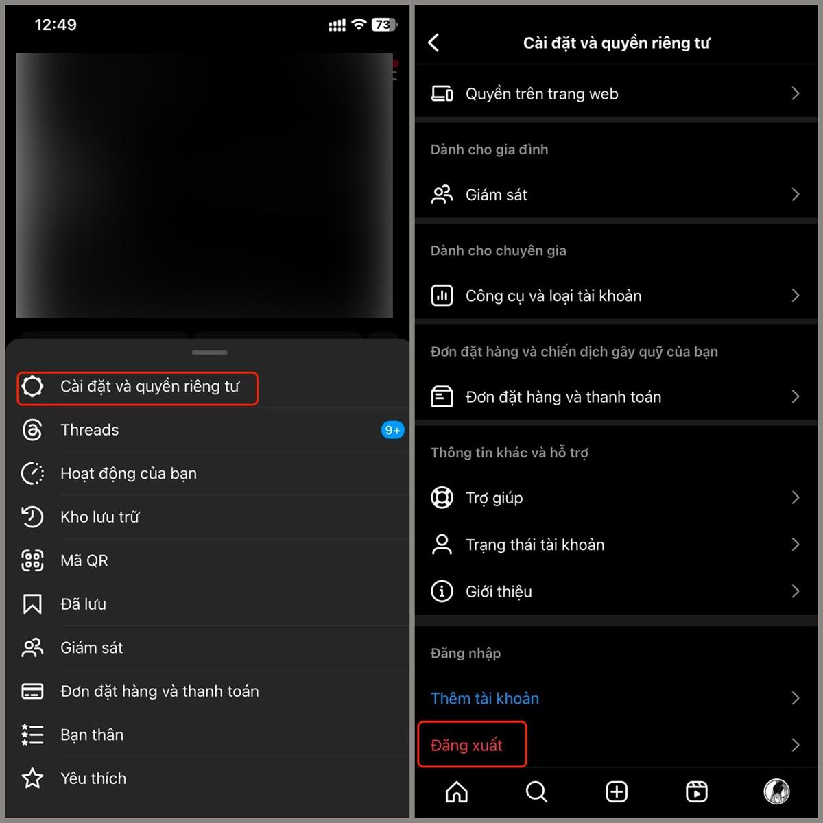 Bước 2: Chọn Cài đặt và quyền riêng tư > Chọn Đăng xuất.