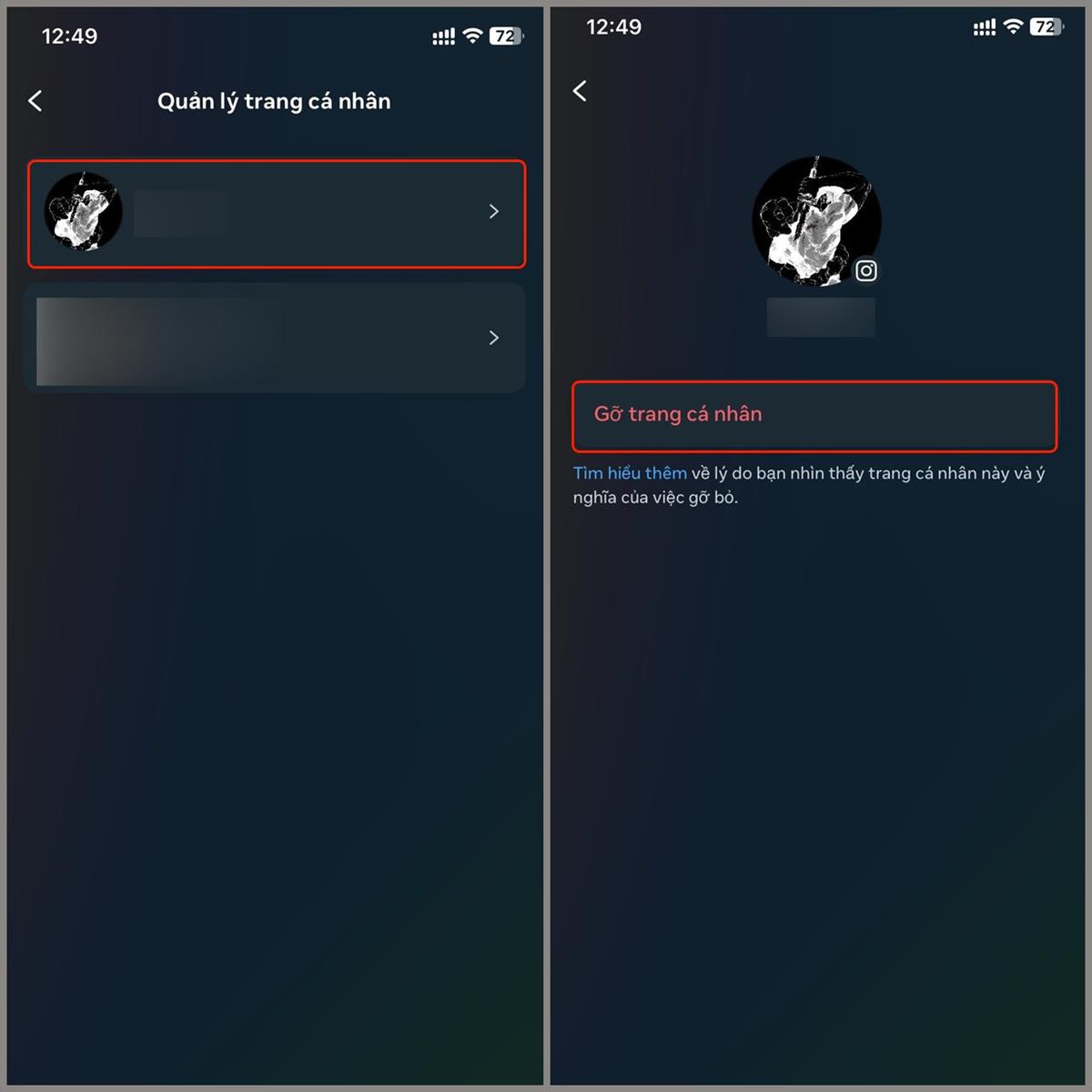 Bước 4: Chọn 1 tài khoản mà muốn xóa > Chọn Gỡ trang cá nhân là xong.
