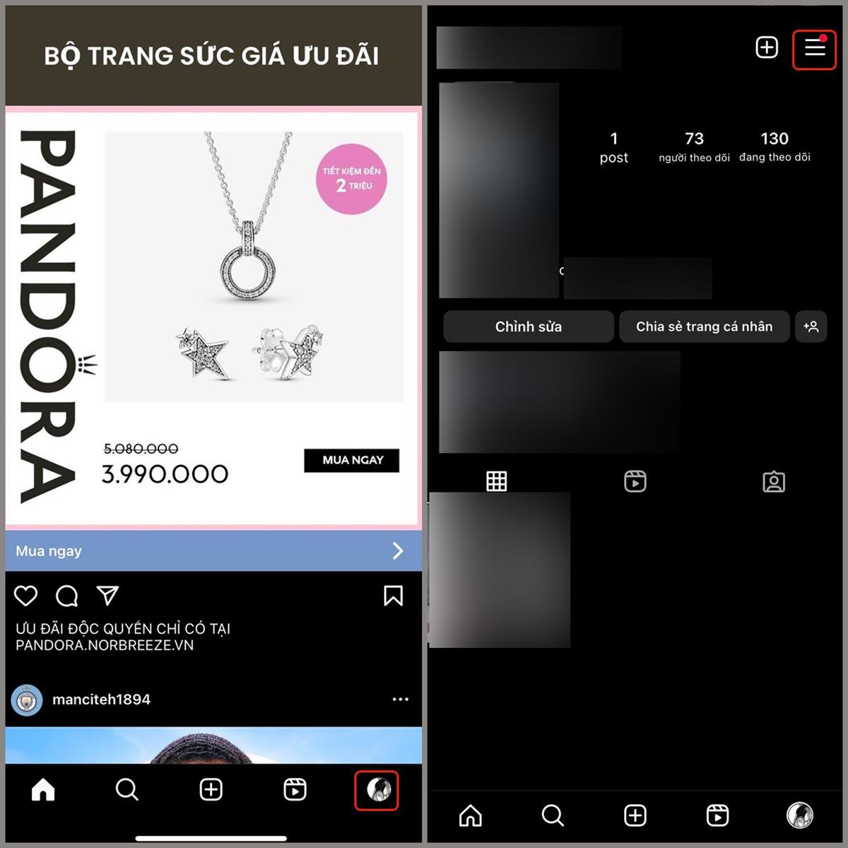 Bước 1: Đầu tiên, vào mục avatar sau khi truy cập vào Instagram > Chọn vào danh mục 3 gạch ngang.
