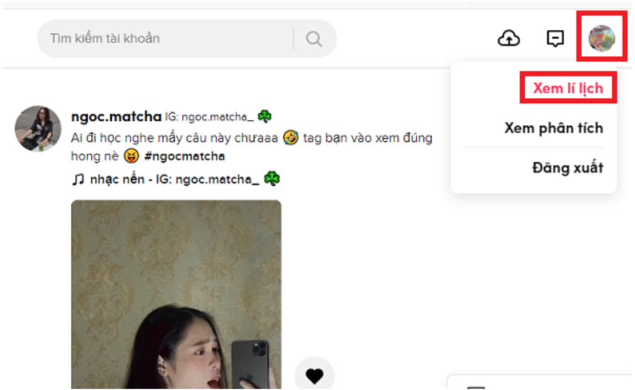 Bước 1: Đầu tiên, bạn truy cập vào TikTok trên máy tính -> Tại giao diện chính, chọn vào Ảnh đại diện ở bên trên góc phải -> Ấn vào mục Xem lý lịch.
