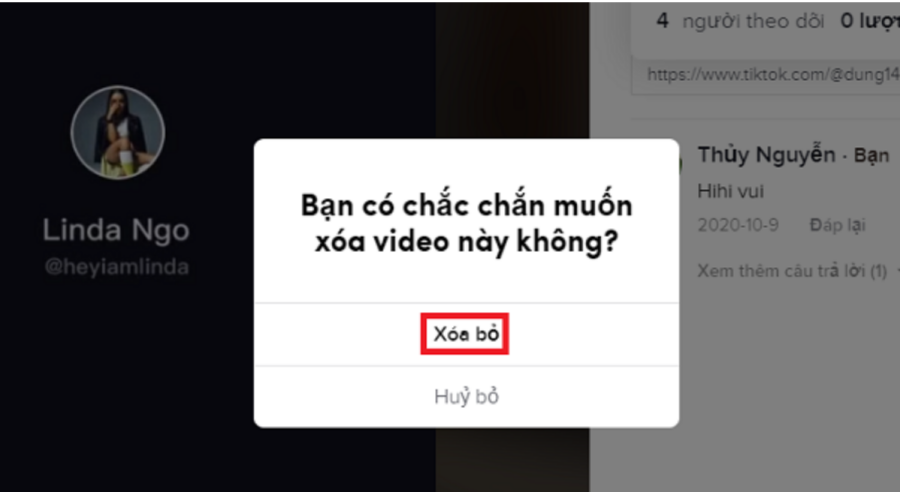 Bước 4: Cuối cùng, hệ thống sẽ hỏi bạn có chắc chắn muốn xóa video hay không, tiến hành ấn vào mục Xóa bỏ để xác nhận là hoàn tất.