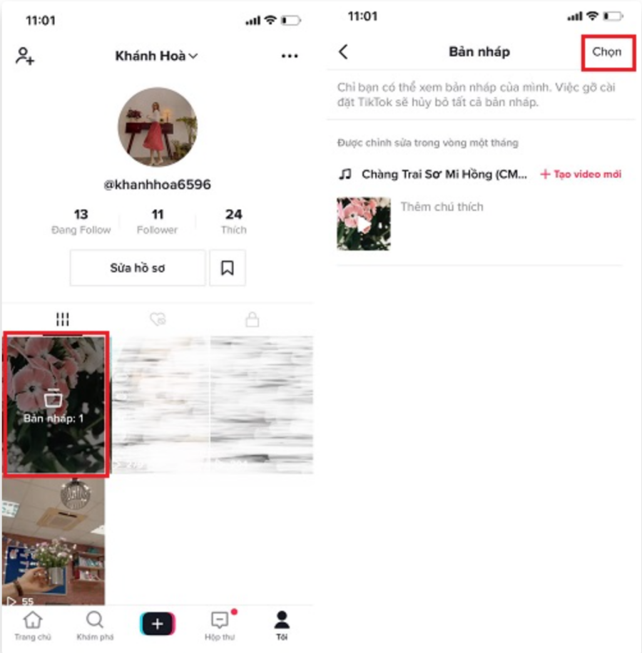 Bước 2: Tiếp theo, màn hình sẽ hiển thị tổng hợp video của bạn trên TikTok -> Bấm chọn video Nháp cần xóa -> Click vào mục Chọn ở phía trên góc phải màn hình.