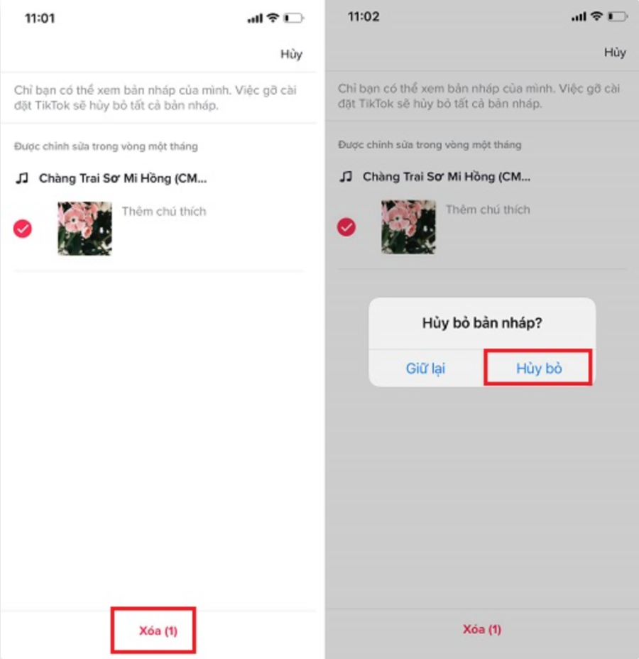 Bước 3: Sau đó, ấn dấu tick vào ô bên cạnh video nháp cần xóa -> Nhấn chọn Xóa bên dưới màn hình. Sau khi thực hiện thành công, hệ thống sẽ hiển thị bản tùy chọn bấm Hủy bỏ để xóa hoàn toàn video nháp trên TikTok là hoàn tất.