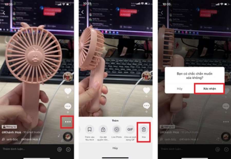 Bước 3: Cuối cùng, ấn vào biểu tượng dấu 3 chấm -> Tiến hành kéo sang phải chọn mục Xóa -> Chọn Xác nhận để hoàn thành thao tác xóa video riêng tư là xong.