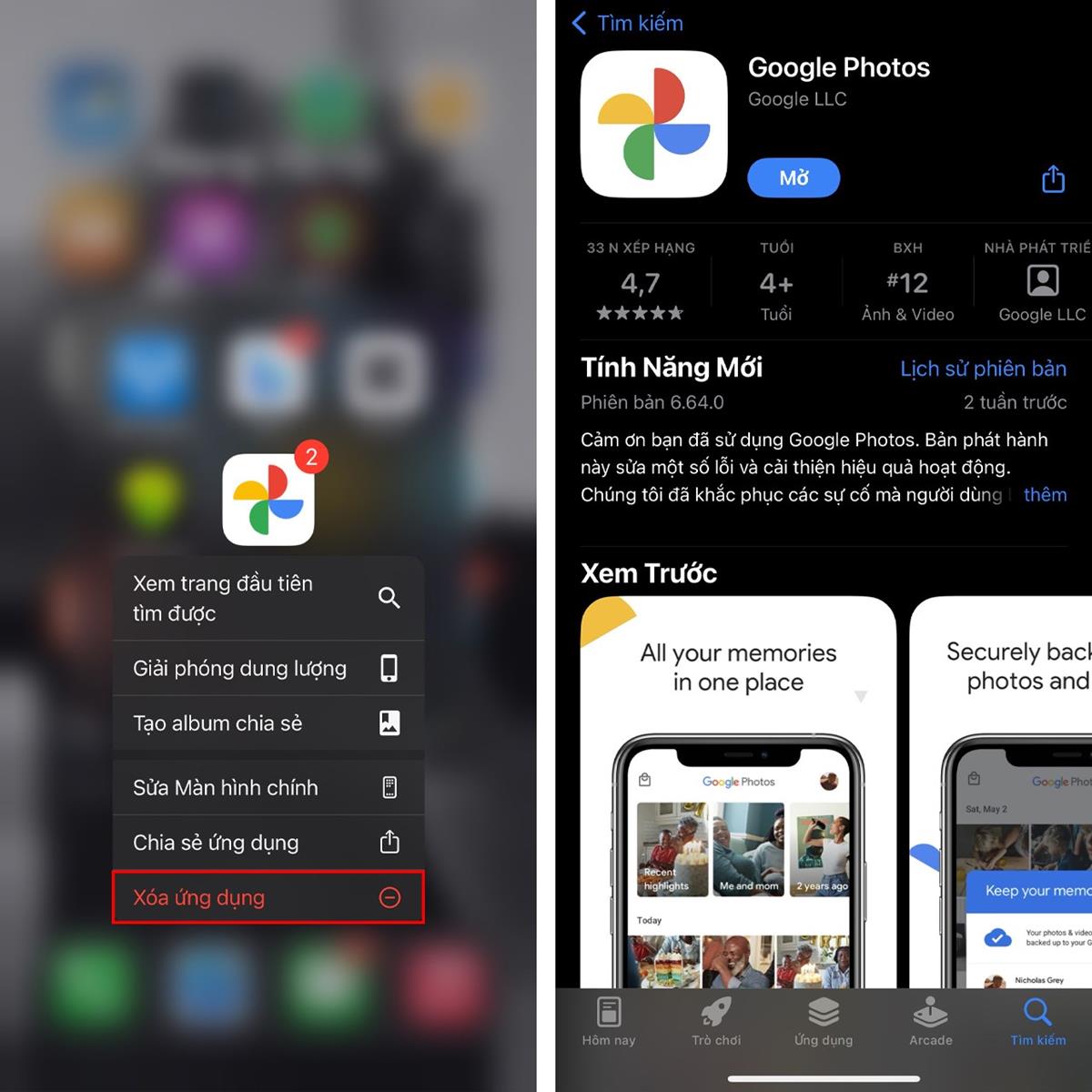 Một giải pháp khác là thực hiện việc gỡ bỏ và cài đặt lại ứng dụng Google Photos. Cách này đơn giản nhưng hiệu quả, vì việc gỡ bỏ và cài lại sẽ đưa ứng dụng được reset về trạng thái mới lại.