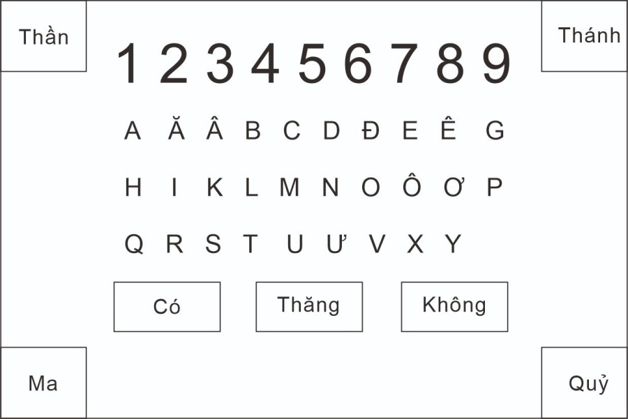 1 tấm bảng được làm từ miếng gỗ lớn (gỗ ván hòm càng linh thiêng). Ở trên bảng ghi các chữ cái, chữ số (ở Việt Nam ghi 29 chữ cái cả dấu), 10 con số từ 0 – 9 và 2 từ Yes và No. Lưu ý, ở 4 góc phải vẽ ô “thần”, “thánh”, “ma”, “quỷ” và chữ “thăng” để biết linh hồn vừa nhập vào là hiền hay dữ.