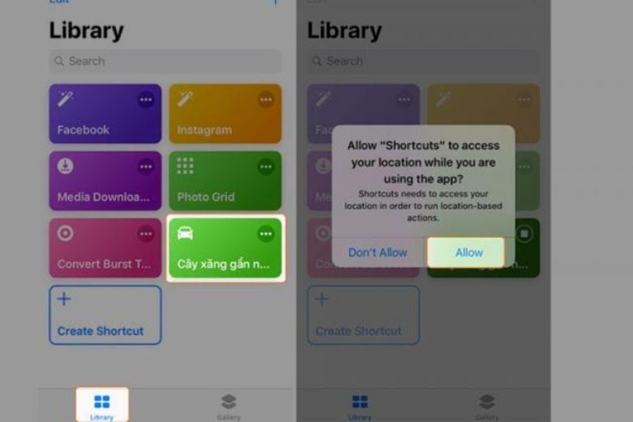 Bước 2: Tiếp theo, bạn chuyển lại phần Library -> Bấm chọn phím tắt “Cây xăng gần nhất” và cho phép ứng dụng truy cập định vị GPS hiện tại của bạn bằng cách chọn Cho phép (Allow).