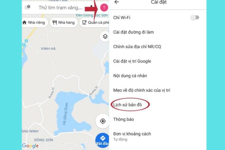 Bước 1: Đầu tiên, bạn mở ứng dụng Google Maps -> Tại phần giao diện chính bạn bấm chọn Cài đặt -> Ấn chọn Lịch sử bản đồ (Maps history).