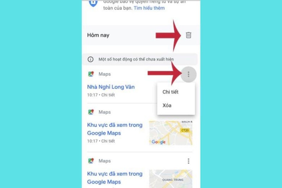 Bước 2: Khi đó, bạn sẽ thấy được những phần lịch sử đã lưu theo ngày/tháng -> Click vào biểu tượng 3 chấm bên cạnh phải để xem lại địa điểm cây xăng gần nhất -> Bấm vào biểu tượng thùng rác để xoá đi lịch sử tìm kiếm địa điểm cây xăng gần nhất.