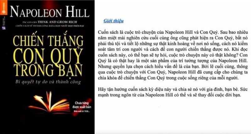 Cuốn sách "Chiến Thắng Con Quỷ Trong Bạn" của tác giả Napoleon Hill là một cuộc trò chuyện của Napoleon Hill và Con Quỷ. Sau bao nhiêu năm miệt mài nghiên cứu cuối cùng ông cũng phát hiện ra Con Quỷ, bắt nó phải thú tội và tiết lộ những sự thật kinh hoàng về nơi nó sống, cách nó kiểm soát tâm trí con người và cách để con người chiến thắng được nó. Khi đọc cuốn sách này, có thể bạn sẽ tự hỏi, cuộc trò chuyện này có thật không? Con Quỷ là có thật hay là một sản phẩm của trí tưởng tượng của Napoleon Hill.
