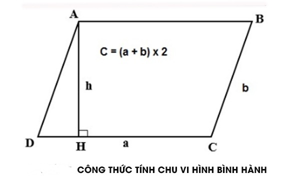 Chu vi hình bình hành được tính bằng tổng 2 cạnh kề nhân với 2 (cùng 1 đơn vị đo).