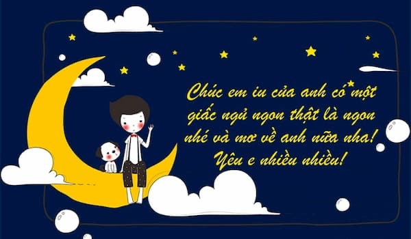 Chúc chàng ngốc của em ngủ ngon và mơ những giấc mơ đẹp nhất và 1 ngày mới sẽ đến với anh trong niềm vui và hạnh phúc. Yêu anh nhiều lắm ý!
