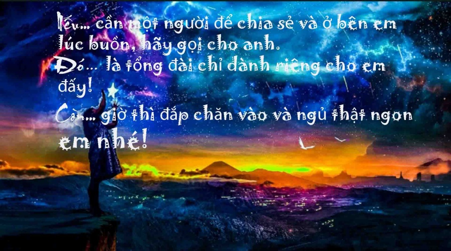 Châu Âu ngủ, châu Á cũng đang ngủ, châu Mỹ đang tối dần, chỉ có đôi mắt đẹp nhất trên thế gian này đang đọc tin nhắn của anh. Chúc tình yêu bé nhỏ của anh ngủ thật ngon và có những giấc mơ ngọt ngào nhé! Yêu em!