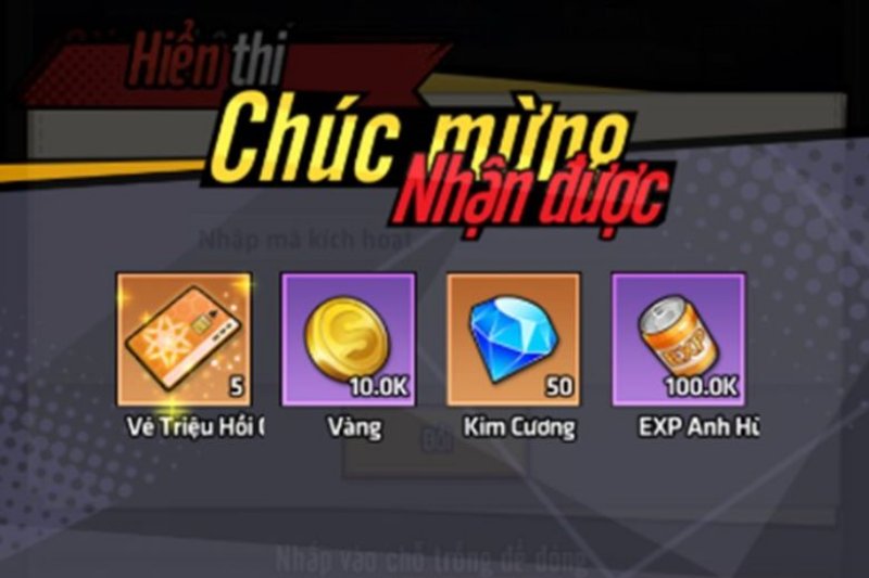 | HVBVASUNA | x50 mãnh asuna, x100.000 điểm kinh nghiệm anh hùng, x30 đá tiến bậc, x100.000 vàng | Còn hạn |