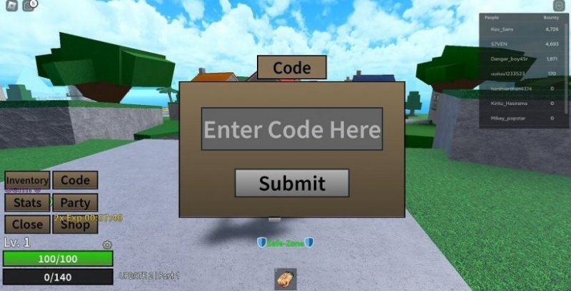 - Hướng dẫn nhanh: Đầu tiên, bạn truy cập vào Roblox và chọn chế độ chơi Legend Piece -> Bấm chọn Menu -> Ấn chọn mục Code -> Tiến hành nhập code và nhấn Submit là hoàn thành.