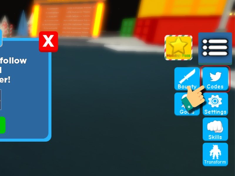 Đầu tiên, bạn vào Roblox, ấn chọn Super Power Fighting Simulator -> Bấm vào biểu tượng danh sách bên phải màn hình -> Nhấn chọn ô Codes (biểu tượng con chim màu trắng) -> Tiến hành nhập code -> Click chọn Redeem là hoàn tất.