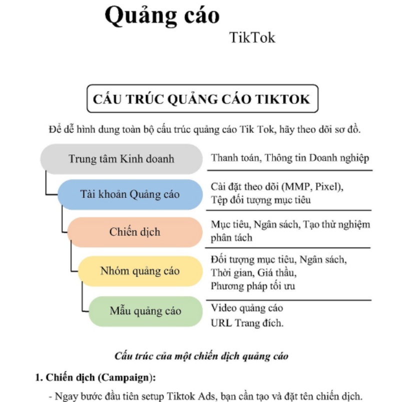 - Phần 1: Các kiến thức quảng cáo trên Tik Tok. Trong đó bao gồm các chủ đề như cách tạo tài khoản Tik tok, tìm hiểu về trung tâm doanh nghiệp, các loại quảng cáo trên Tik tok và cách tối ưu hóa chi phí quảng cáo.