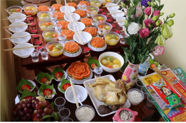 - Hương hoa: Hương, lọ hoa nhiều màu, tiền vàng, nước trắng.