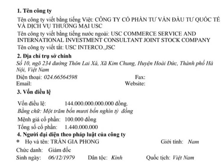 Đó là CTCP Tư vấn đầu tư quốc tế và dịch vụ thương mại USC (USC Interco), có trụ sở chính tại Số 10, ngõ 234 đường Thôn Lai Xá, Xã Kim Chung, Huyện Hoài Đức, Thành phố Hà Nội. Theo Cổng thông tin quốc gia về đăng ký doanh nghiệp, doanh nghiệp “tỷ đô” đăng ký ngành nghề chính là bất động sản.