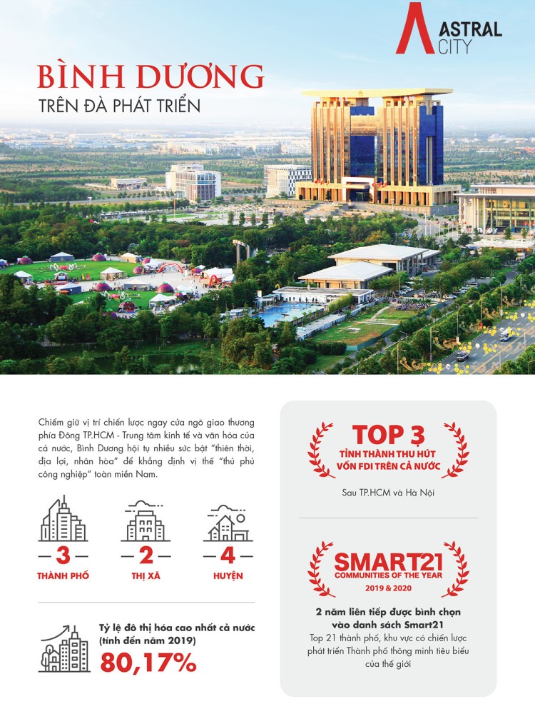 Astral City là Khu Phức hợp Thương mại & Căn hộ cao cấp lớn nhất tại Bình Dương, với quy mô lên đến 4.982 căn hộ, shophouse thương mại, duplex,… được xây dựng trên diện tích đất 3.7ha gồm 08 block. Đây cũng là dự án cao cấp nhất Bình Dương với thiết kế tiện ích khác biệt mang tầm vóc của một công trình kiến trúc ấn tượng, được kỳ vọng sẽ trở thành Biểu tượng mới của tỉnh Bình Dương.