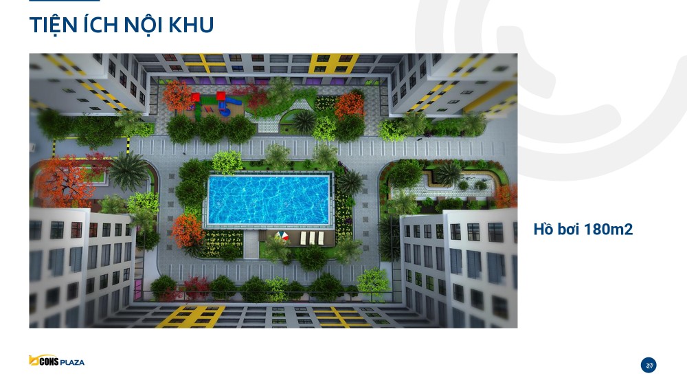 Bên trong dự án Bcons Plaza có các tiện ích nội khu như: Hồ bơi 180m2, NHÀ TRẺ 2056m2, MẢNG XANH NỘI KHU 2.635m2, phòng sinh hoạt cộng đồng 1.071m2, Khu Trường học, khu công viên, hồ bơi cao cấp, phố đi bộ, khu vui chơi giải trí trẻ em và người lớn, diện tích cây xanh.
