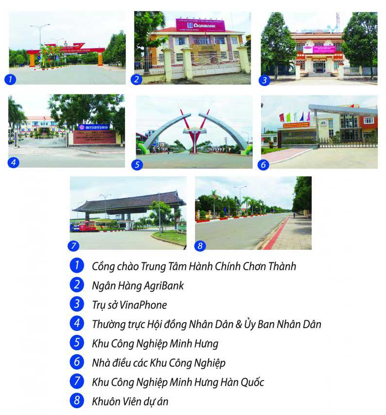 Dọc hai bên tuyến đường bố trí các dãy nhà phố, có chức năng vừa ở vừa có thể kết hợp kinh doanh. Ngoài ra cư dân sống tại dự án còn thừa hưởng một số tiện ích như trung tâm Hành Chính Huyện Chơn Thành, Tiện ích Tom's MArt, Trung tâm Ý tế huyện Chơn Thành, Công ty TNHH Nam Sơn, KCN Minh Hưng, Trụ sở VinaPhone, Ngân hàng AgriBank.
