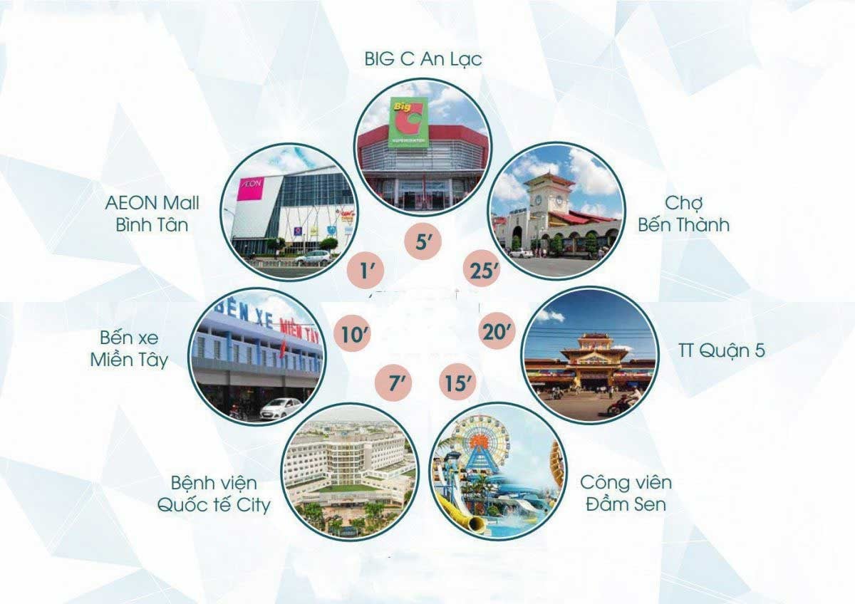 10 phút: Di chuyển đến AeON Mall Bình Tân, Bệnh viện Quốc tế City, Công viên Phú Lâm