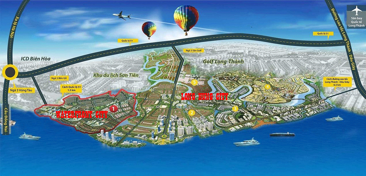 Trong bán kính chỉ khoảng 5 km, từ Waterfront city dễ dàng tiếp cận các tuyến giao thông huyết mạch kết nối liên vùng như quốc lộ 51, quốc lộ 1A, xa lộ Hà Nội, đại lộ Mỹ Phước – Tân Vạn – Nhơn Trạch, cao tốc TPHCM – Long Thành – Dầu Giây, Đường vành đai 3, cảng hàng không quốc tế Long Thành và Metro Bến Thành – Suối Tiên – Biên Hòa,… Khu vực này cũng đang tập trung hàng loạt khu công nghiệp lớn như Biên Hòa 1 và 2, Amata, Long Bình, Tam Phước, Long Thành.