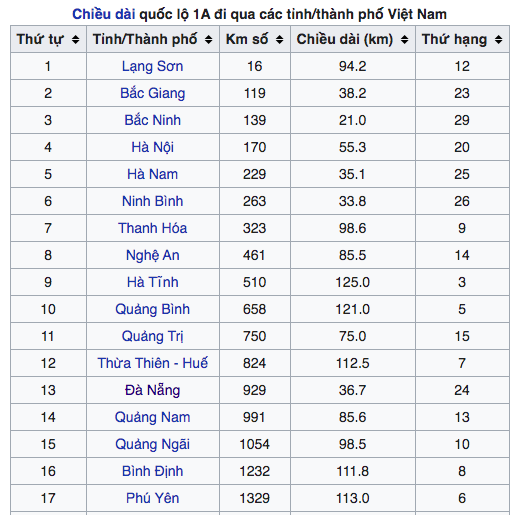 Chiều dài Quốc lộ 1A đi qua các tỉnh sắp xếp theo các tỉnh