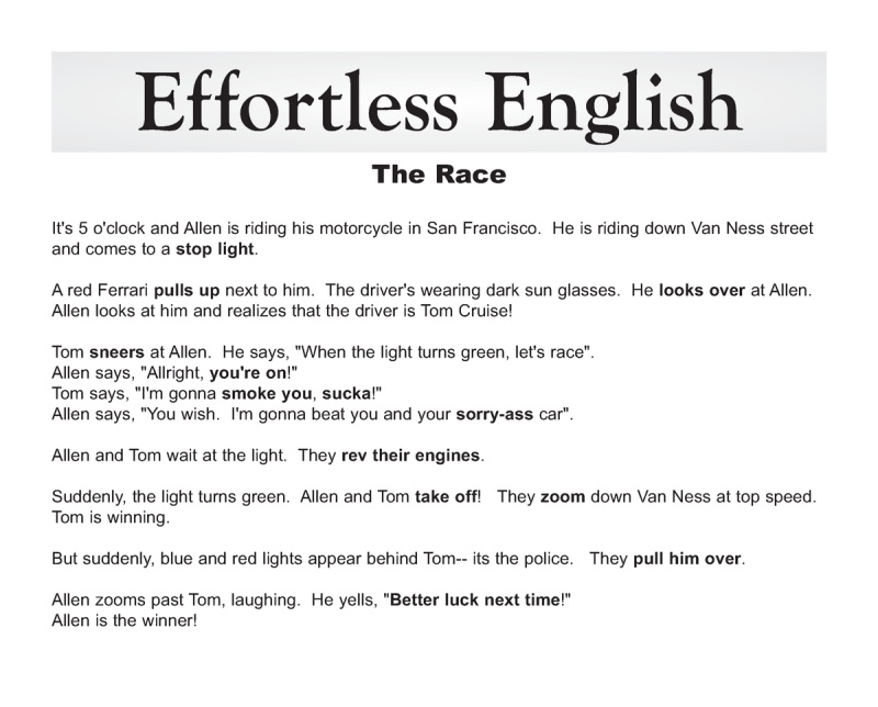 Bộ giáo trình được biết đến là một trong những phương pháp học tiếng Anh giao tiếp theo hướng chuẩn Mỹ hiệu quả nhất hiện nay. Điều đặc biệt là, phương pháp này được áp dụng ở hầu hết các quốc gia. Cuốn sách được biên dịch ra nhiều ngôn ngữ khác nhau. Tại Việt Nam, cuốn sách mang tên: “Luyện nói Tiếng Anh Như Người Bản Ngữ” – Effortless English (dịch bởi The Windy).