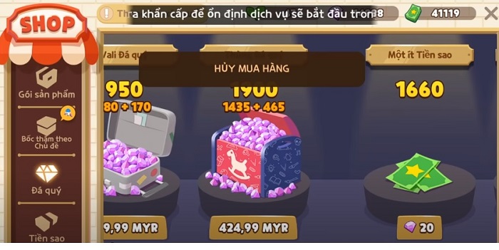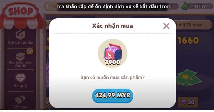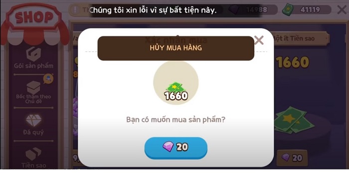 Bước 3: Sau khi bạn có cần câu rồi thì bạn nhấn vào dấu cộng kim cương => Giao diện sẽ lập tức chuyển đến Cửa hàng tài sản => Bạn nhấn vào gói nhiều tiền nhất là 1900 đá quý.