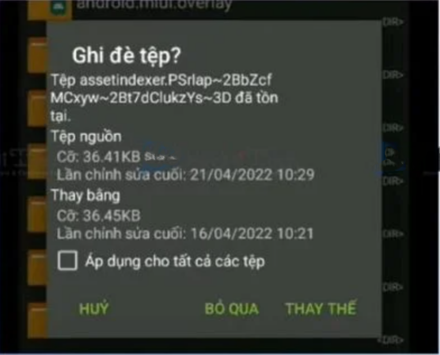 Bước 6: Kế đến, bạn tick vào Áp dụng cho tất cả các tệp -> Bấm chọn Thay Thế tại cửa sổ Ghi đè tệp