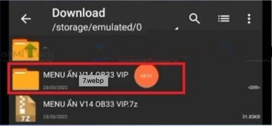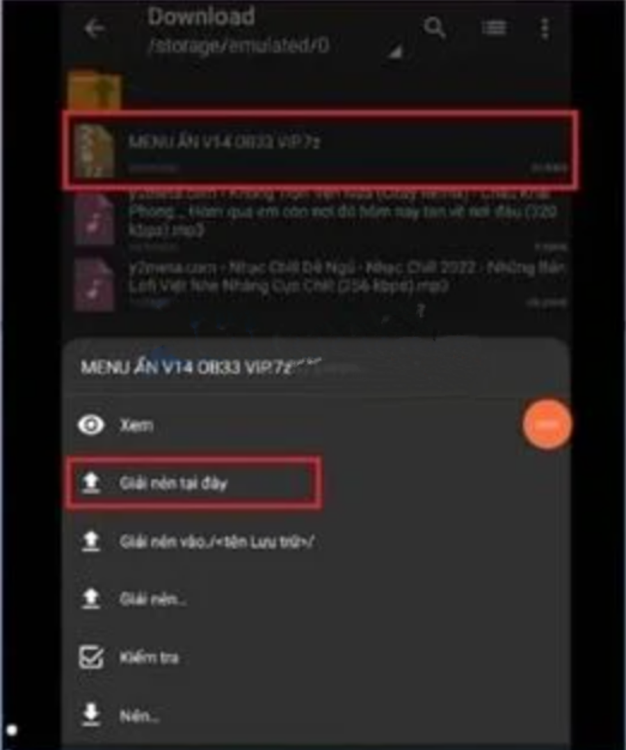 Bước 2: Sau đó, bạn mở ứng dụng Zarchiver -> Tiến hành vào thư mục Download -> Bấm vào tập tin MENU ẨN V14 OB33 VIP.7z -> Ấn chọn Giải nén tại đây