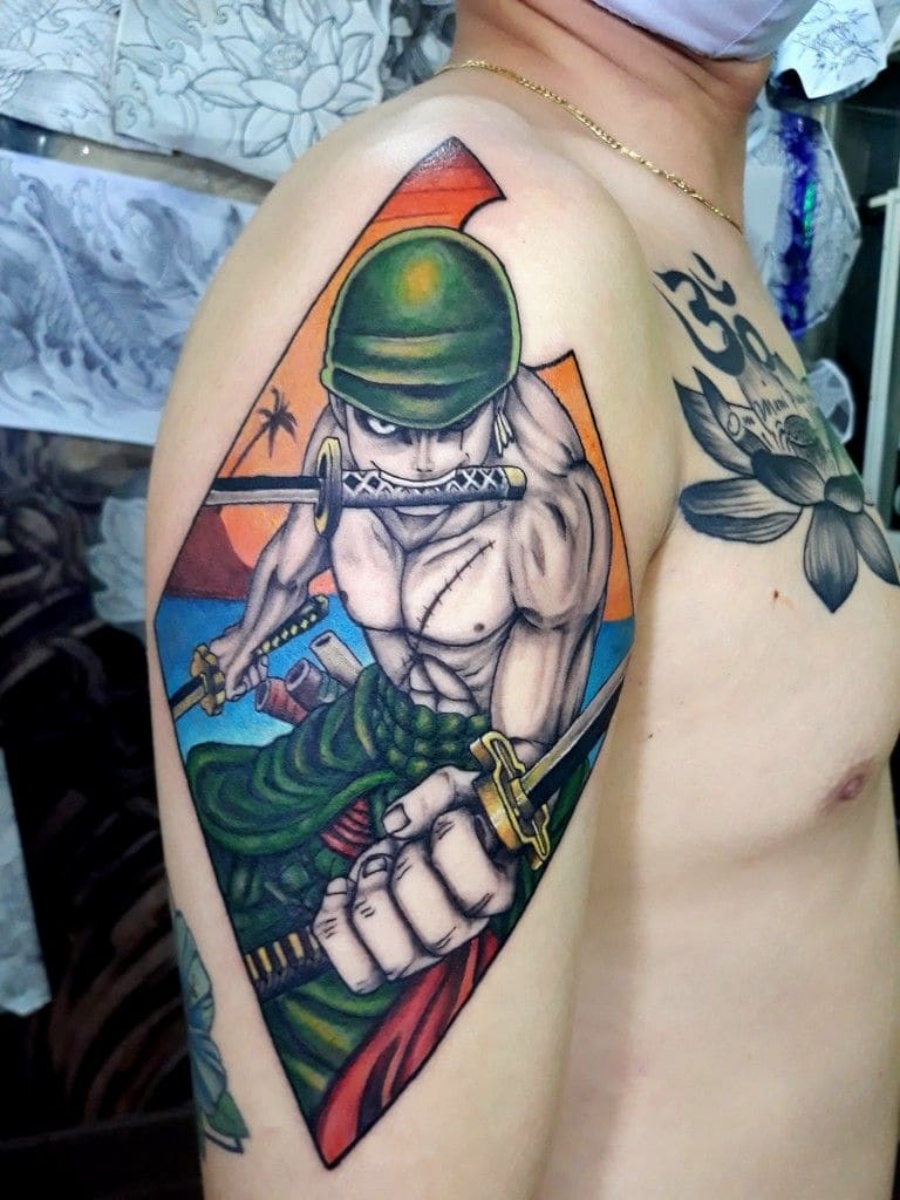 Roronoa Zoro cũng là thành viên đầu tiên của băng hải tặc Mũ rơm được rất nhiều bạn trẻ ưa thích. Zoro xuất hiện với làn da rám nắng, mạnh mẽ và nam tính chắc hẳn đốn gục được trái tim phái đẹp khi tái hiện mẫu tattoo này trên cơ thể các bạn nam.