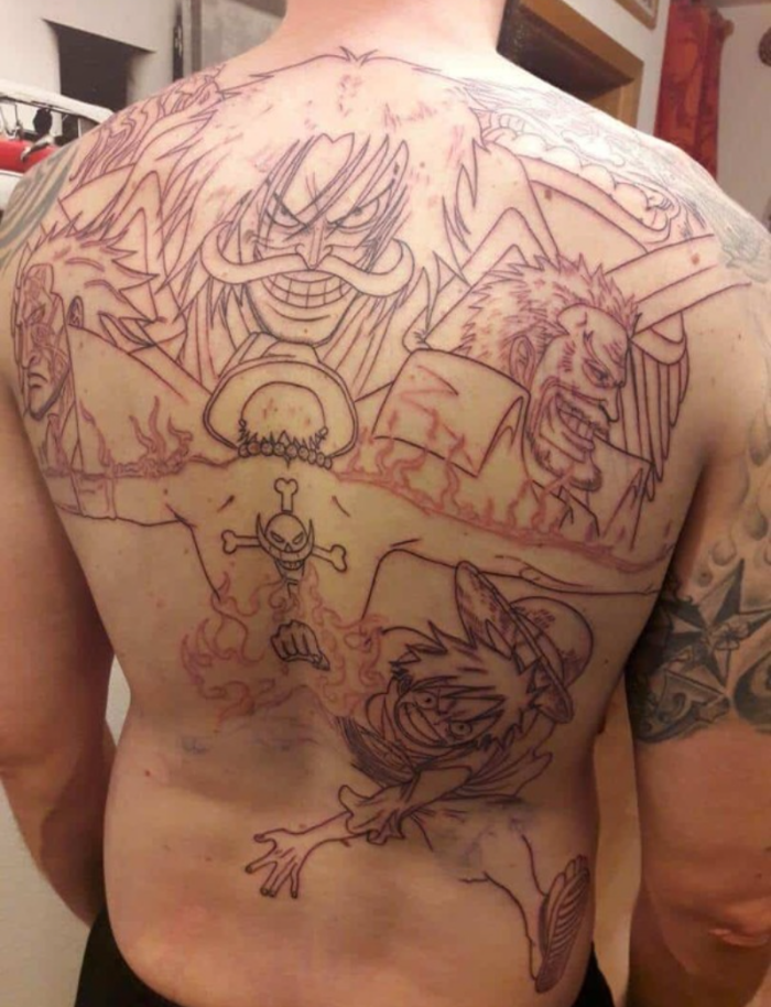 Trên tất cả các bộ phận trên cơ thể thì lưng được biết đến là bộ phận to lớn nhất. Cũng chính vì thế, một số người thể hiện tình yêu của mình đối với bộ truyện tuổi thơ này bằng cách xăm hình kín lưng. Cùng đội ngũ INVERT chúng tôi chiêm ngưỡng mẫu tattoo Luffy kín lưng vô cùng ấn tượng và độc đáo sau.