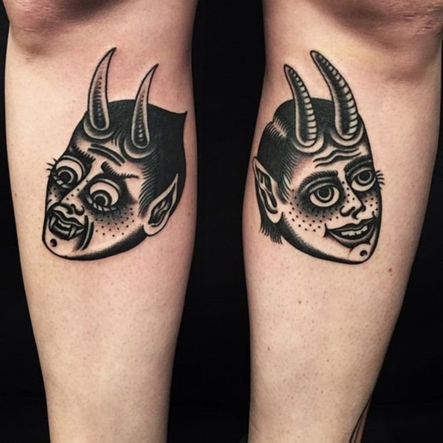 Hình xăm mặt quỷ cũng thể hiện được ý nghĩa song hành của những mặt tốt và mặt xấu trong mỗi người. Hình xăm này sẽ thật sự mô tả được đúng ý nghĩa song hành và đối lập đó nếu có sự kết hợp với một biểu tượng đại diện cho cái tốt.