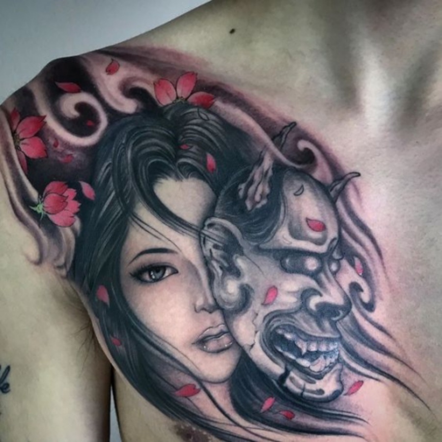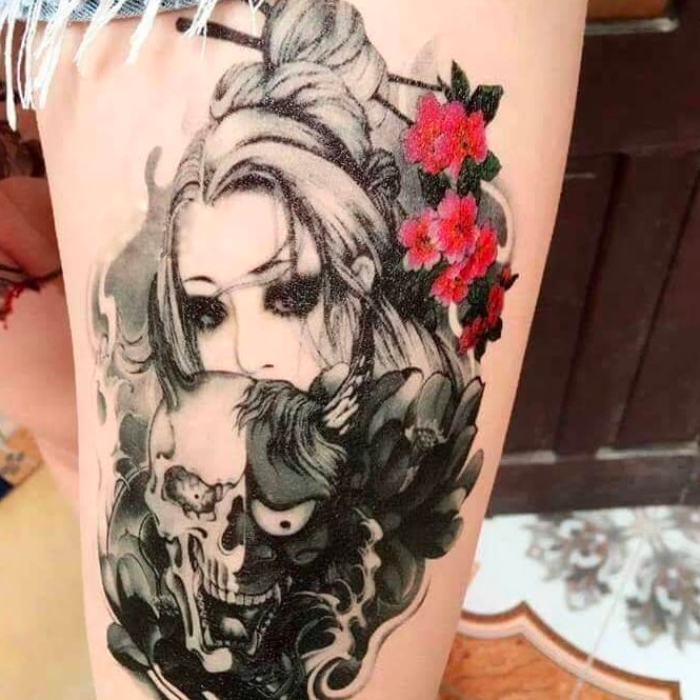 Cô gái mặt quỷ là mẫu hình xăm có phần đáng sợ nhưng lại mang ý nghĩa đặc biệt. Hình ảnh này sẽ phần nào thể hiện được 2 phần thiện ác của con người, đồng thời đem đến sự bí ẩn lôi cuốn thông qua những nét vẽ tinh tế của người xăm hình.