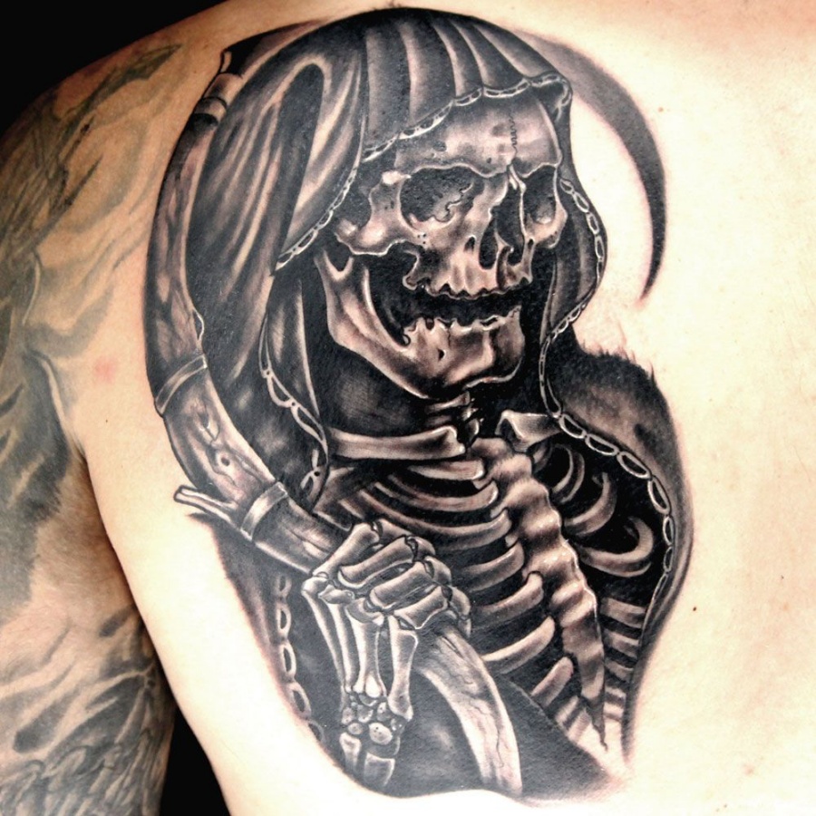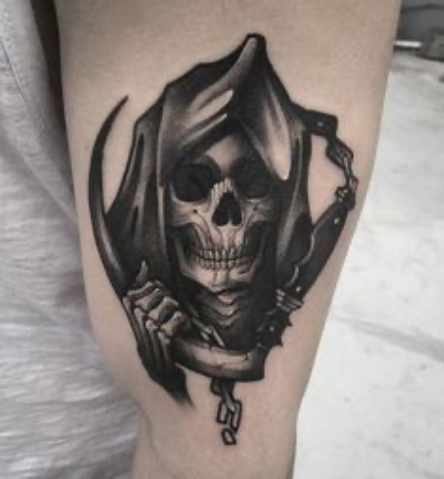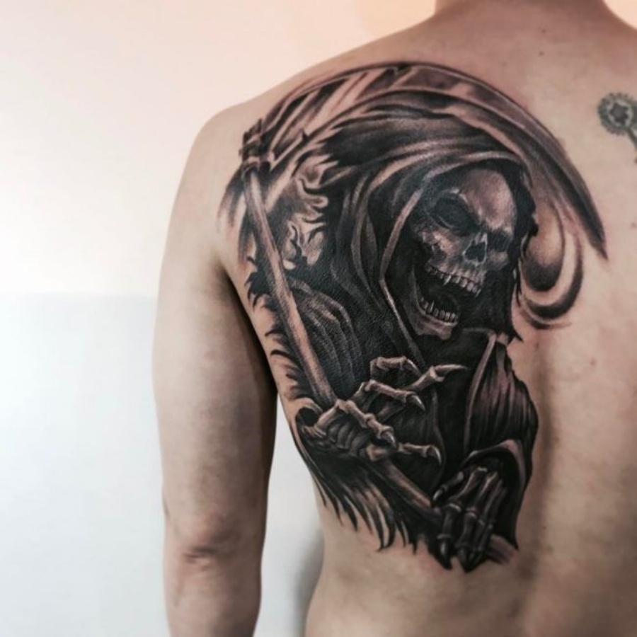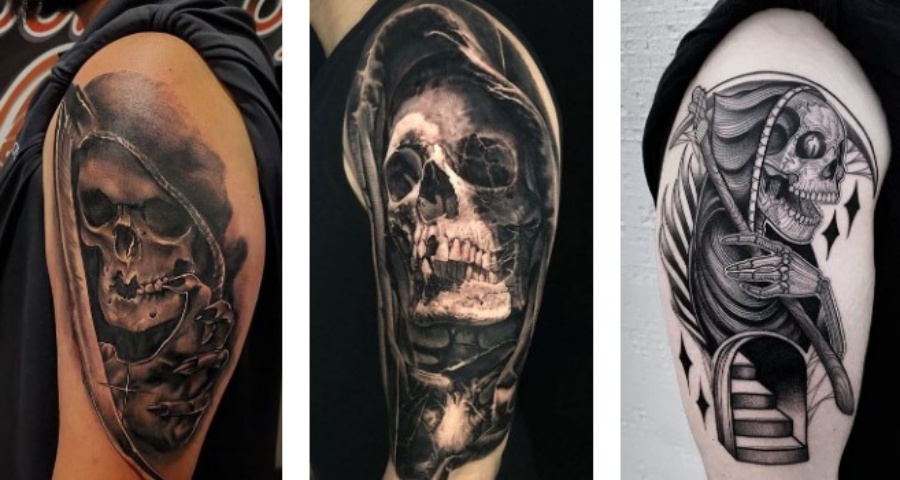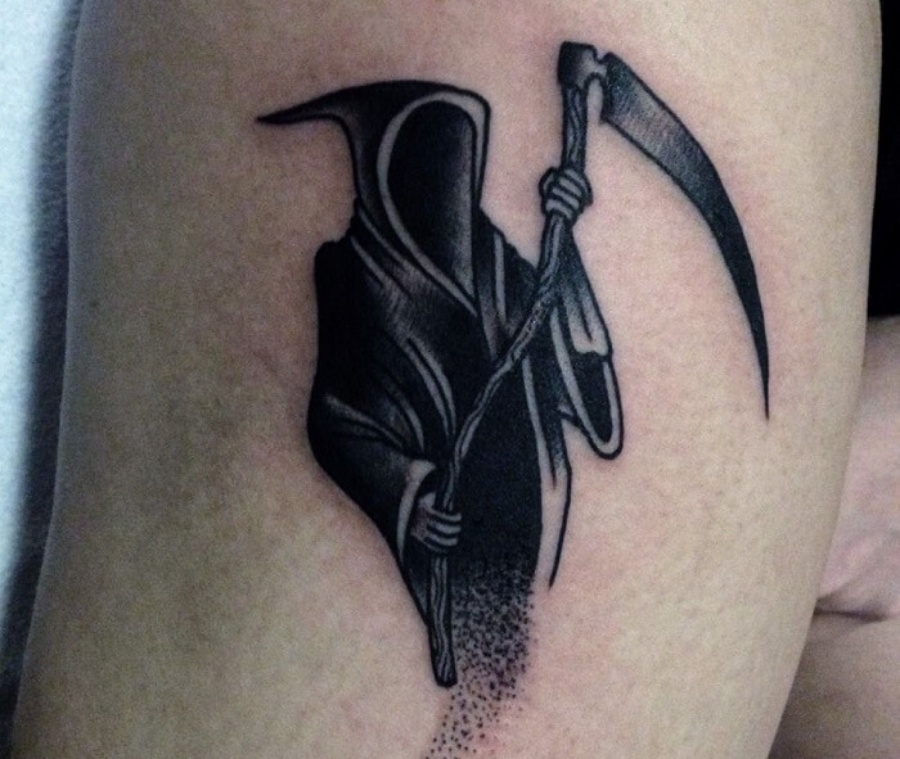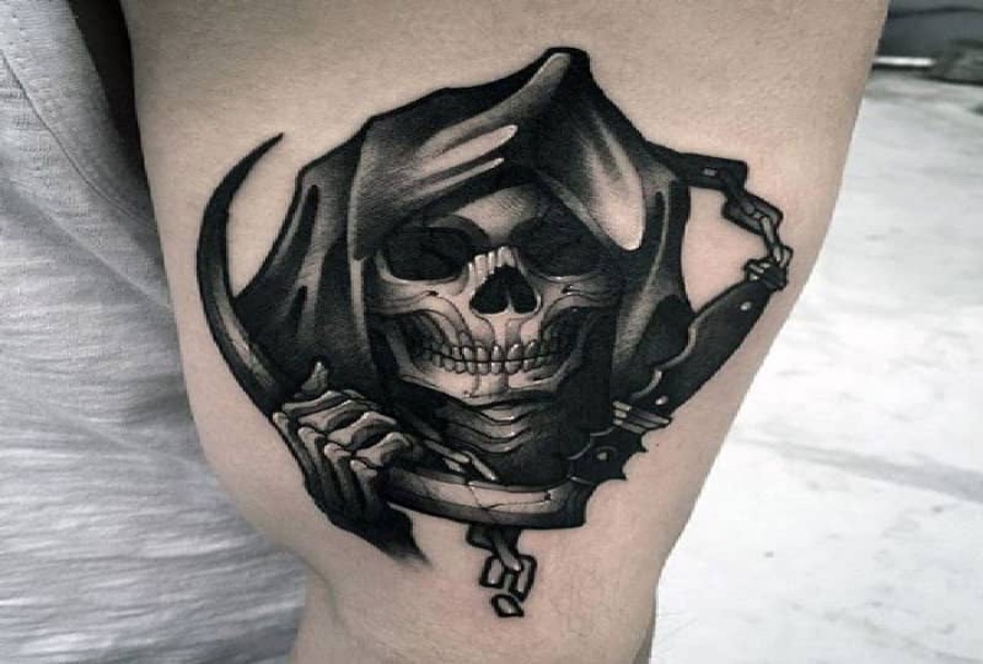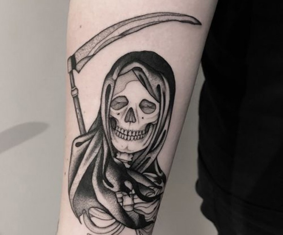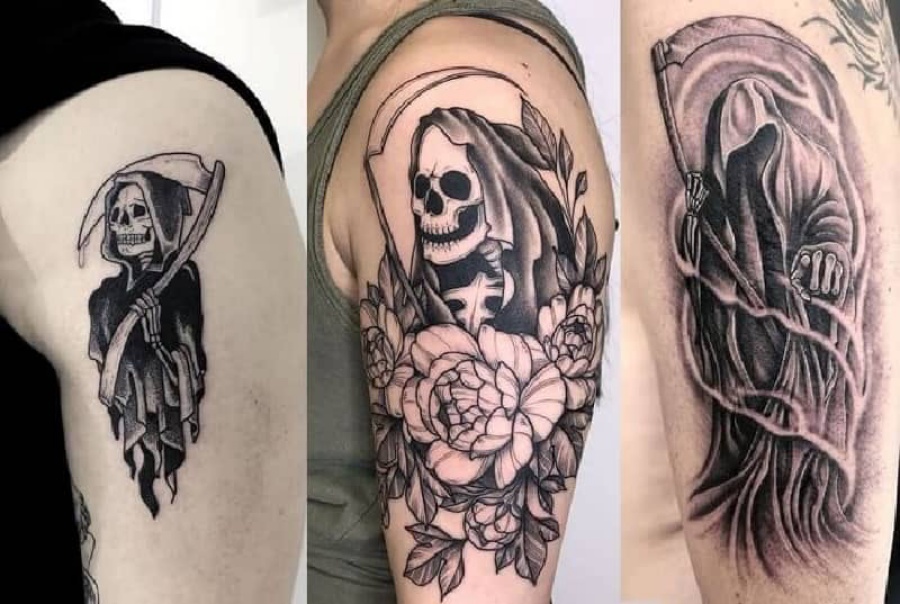 Mẫu hình xăm này thường đặc trưng với hình ảnh một chiếc đầu lâu được phủ chiếc áo đen kín đầu của thần chết và lưỡi hái tử thần trên tay. Hình ảnh này sẽ đem đến cảm giác có phần rợn người và vô cùng cá tính. Tuy nhiên, trên thực tế thì hình xăm này lại mang ý nghĩa ám chỉ bản thân bạn không hề sợ hãi trước cái chết và luôn cố gắng sống thật tốt để không bao giờ hối hận.